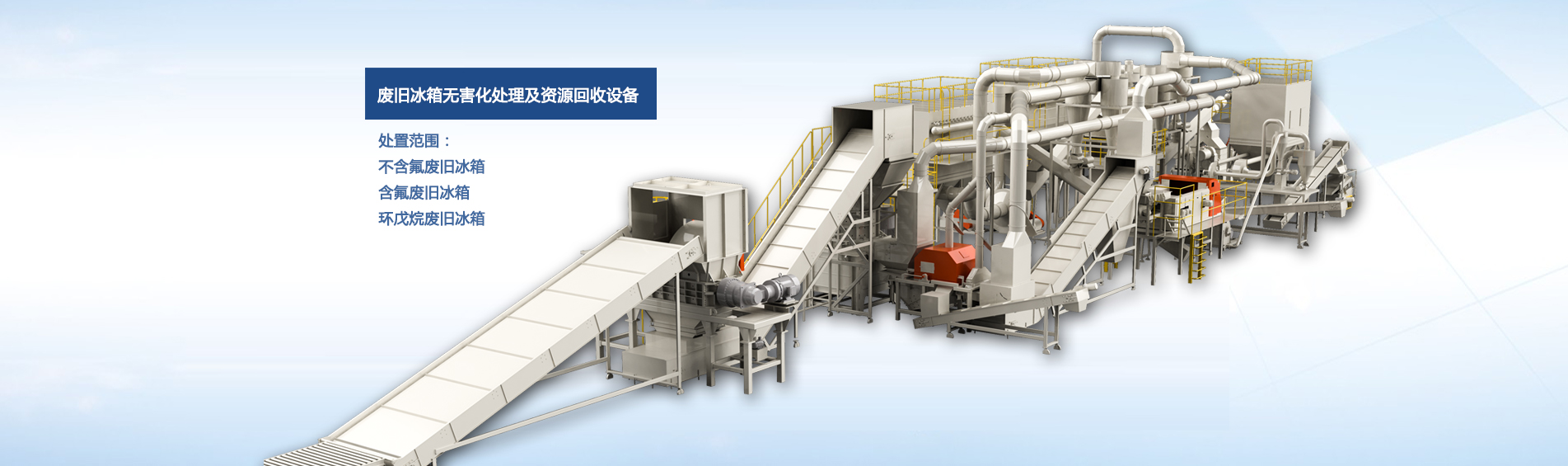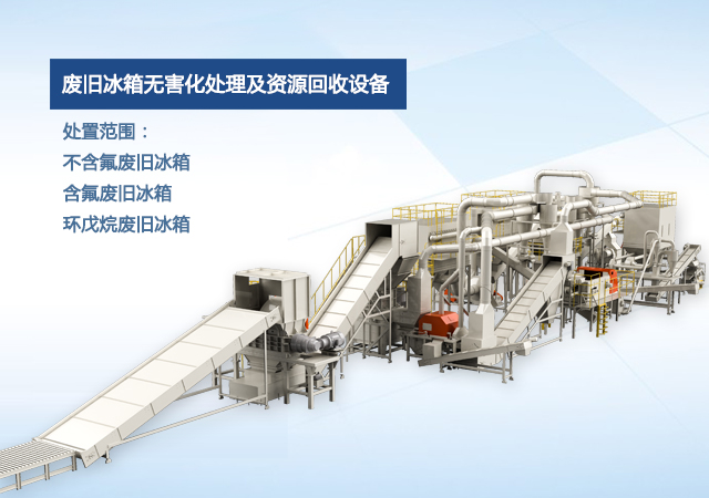 公司自主研發(fā)的廢舊冰箱無害化處理及資源回收技術(shù)及設(shè)備, 獨具 “雙軸撕碎機+立式破碎機+大風(fēng)量稀釋環(huán)戊烷氣體”的專利組合設(shè)計, 主要用于對廢舊冰箱中的各種原材料進(jìn)行分離、 回收和利用, 具有自主知識產(chǎn)權(quán), 經(jīng)國家工業(yè)和信息化部科技成果鑒定為 “填補國內(nèi)空白, 達(dá)到國際先進(jìn)水平” 。